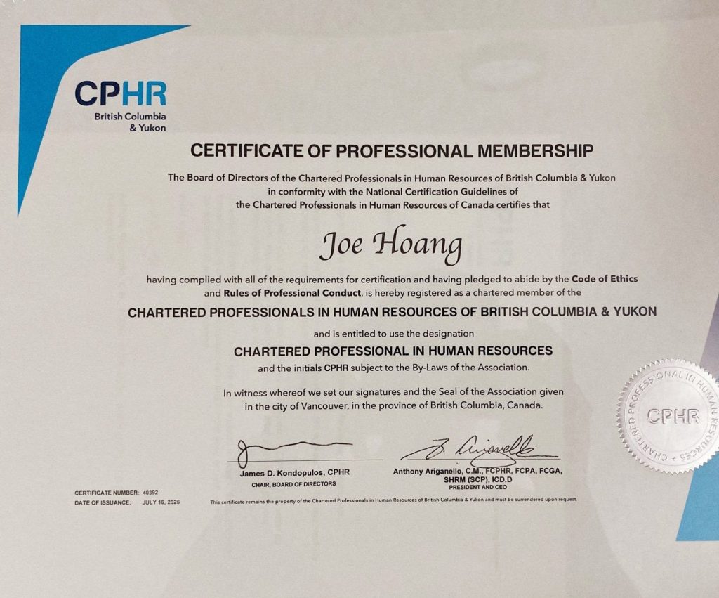 Determined to rebuild my career the right way, I pursued further education in Canada and earned my Post-Baccalaureate Diploma in Human Resources Management from Thompson Rivers University. I later obtained my Chartered Professional in Human Resources (CPHR) designation to strengthen my professional credibility within the Canadian market.